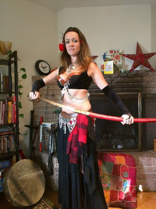 Last year, I didn’t have much of an “official” cosplay, opting instead to wear the Roman bellydance costume I made for my troupe’s spring concert. I also pieced together a sort of fem-Tom costume (which, much like the tree in the woods, does it really count as cosplay if no one gets it?) This year I wanted to do something new, but being short on time and money, decided to kill two birds with one stone and do a new outfit that would work for dance as well as cosplay. Thus I made an outfit for Kahina Seveda, my long-time backup character, an Anarch Lasombra on the Path of Lilith, who is herself a dancer, of North African descent. (Of course, since now I’m playing Scout, she doesn’t even exist as a character except in my own head, but fuck it, I do what I want.)