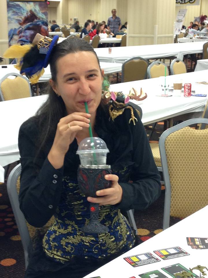 I should also mention, that figure on Kara’s shoulder is a dragon hand-made by an artist who sells them at the con every year. Each are one of a kind, and a real work of art. Kara gets one every year, usually just in pretty jeweled colors. This year, though, she found a steampunk dragon, complete with bronze skin, tiny gears, and its own tiny hat. Everyone agreed it’s the most Kara thing that ever Kara’d.