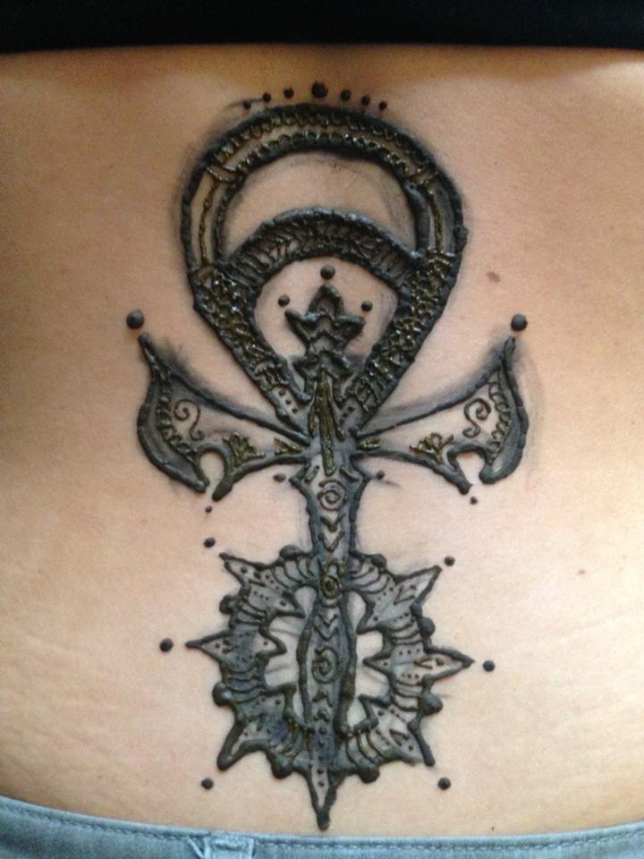 Sadly, I learned last year that World of Darkness does not have a big presence at DragonCon. Still, I wanted to do something to be a little more direct about what I was doing, in case somebody got it. Thus, I commissioned my friend Marie to do henna-work on my back of the Anarch logo. Originally I was thinking just a solid logo, but she brought her full artistic game and came up with a design that also honors the traditional style of henna-work. Here’s the fresh paste right after she completed the work.
